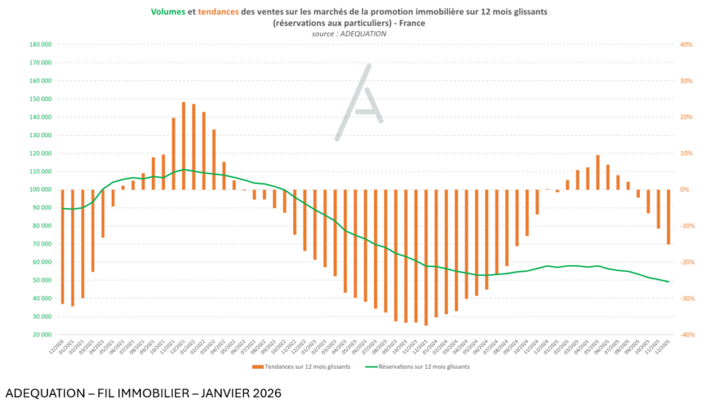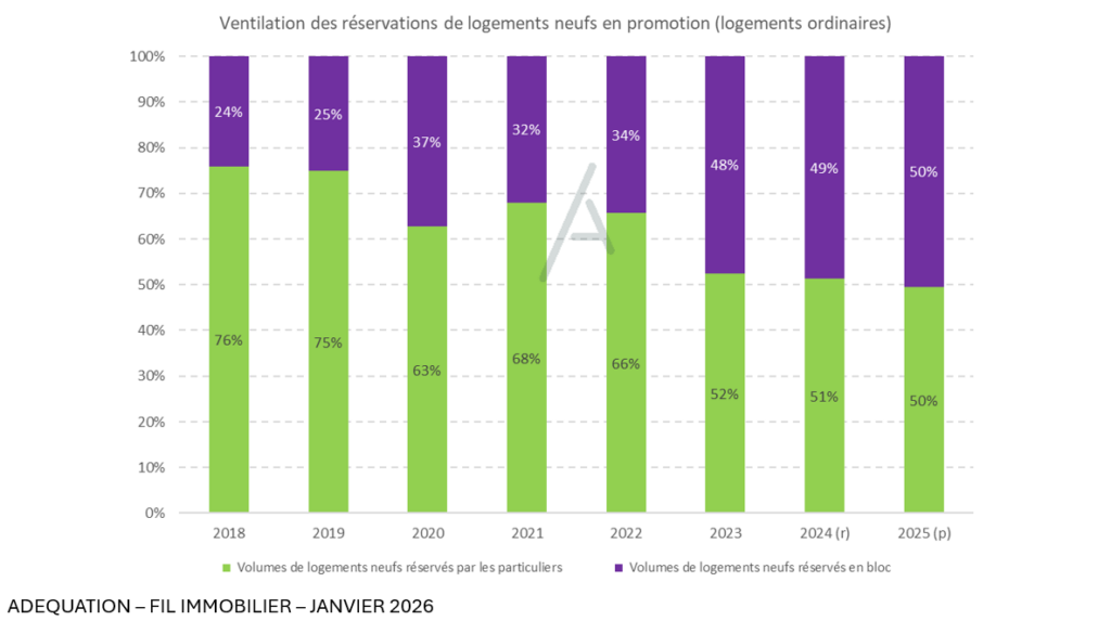 Car si les prix ont globalement résisté — ou se sont ajustés de manière progressive —, les volumes, eux, se sont nettement contractés, en particulier dans le logement neuf. En 2025, les réservations de logements ordinaires par les particuliers en promotion immobilière s’établissent autour de 50 000 unités, en recul par rapport à 2024 et à des niveaux historiquement bas. Les ventes en bloc, d’un volume comparable, sont elles aussi orientées à la baisse. Le marché du neuf s’est donc ajusté principalement par la quantité, et non par la valeur.