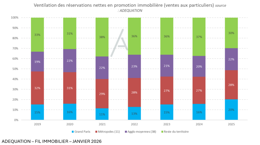 Une progression de la part relative de la région parisienne en 2025, au détriment des marchés les plus modestes. Après une baisse sensible entre 2020 et 2024, le marché de la promotion des grandes métropoles françaises se stabilise enfin (toujours en part relative).